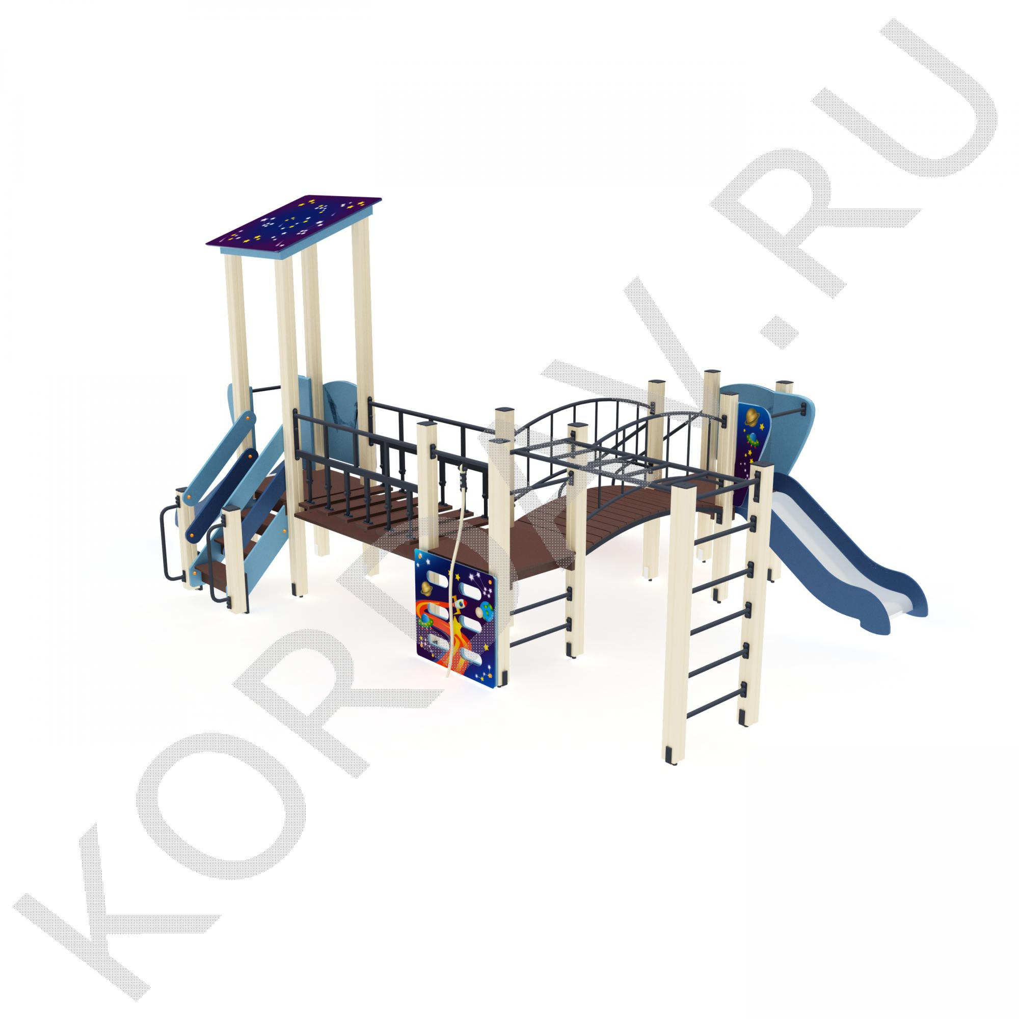 Комплектация: Башни (3 шт.),Ограждения башен (2 шт.),Дугообразный мост (1 шт.),Ограждения дугообразного моста (1 комплект),Лестница (1 комплект),Пандус (1 шт.),Подвесной мост (1 шт.),Скалолаз (1 шт.),Шведская стенка (1 комплект),Рукоход (1 шт.),Горка ( 2 шт.)